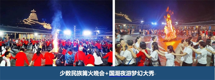 這是一場集廣西侗族苗族風(fēng)情的大型歌舞盛會。寧靜的夜晚,明亮的繁星,燦爛的火光人們手拉手,在山清水秀的明亮篝火中,與身邊的朋友,一起跳舞、狂歡,放松心情。