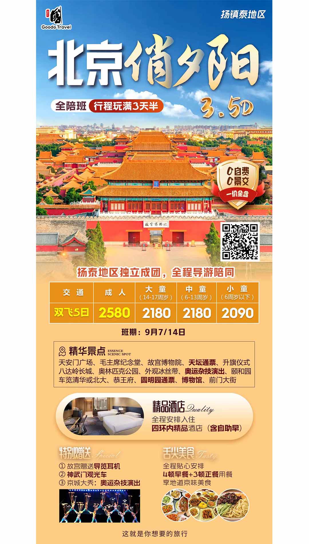 大童(14-18 周歲)含出發(fā)地至北京往返大交通成人票,門(mén)票、車費(fèi)、導(dǎo)服、正餐,其余自理中童(6-13 周歲):學(xué)生門(mén)票、車費(fèi)、導(dǎo)服、正餐,其余自理