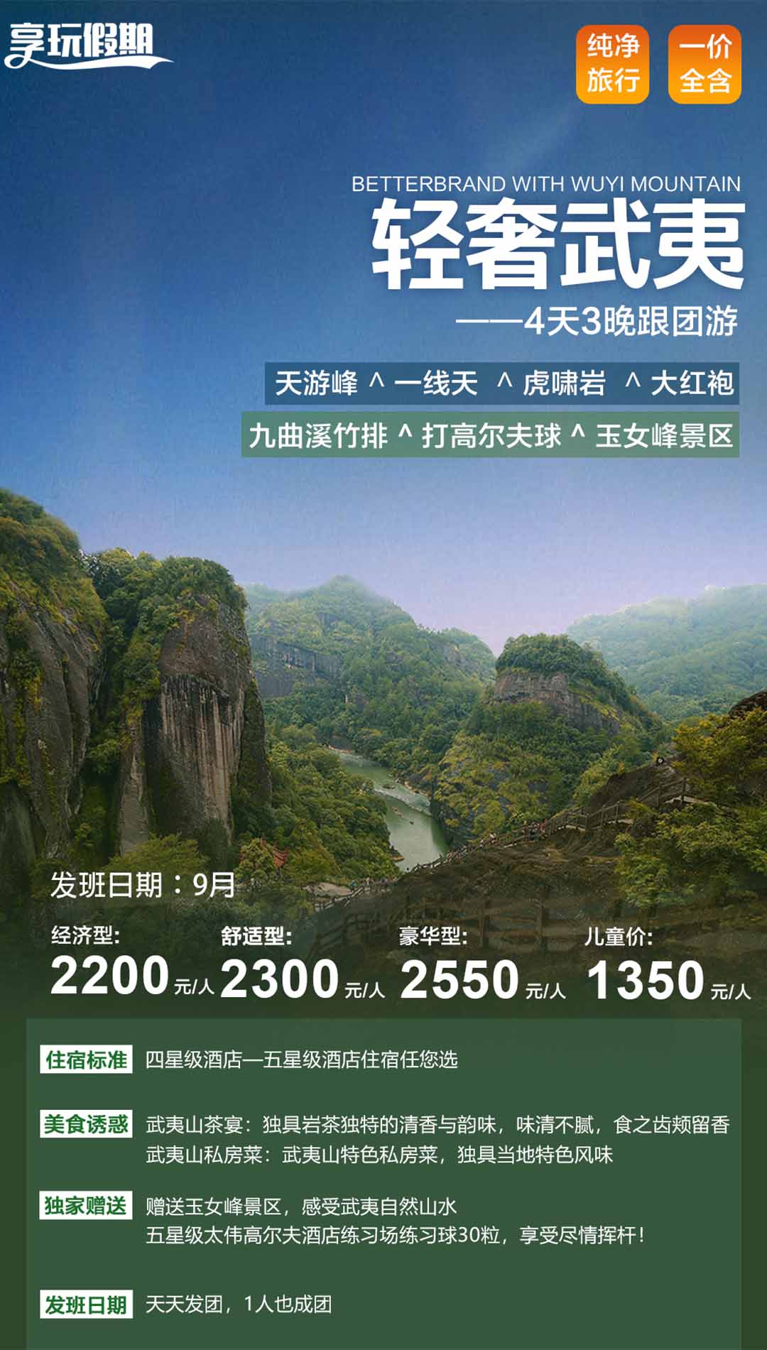 第02天 武夷山-天游峰-九曲溪竹排-濱溪道騎行-袍 | 07:30酒店叫早(請(qǐng)?zhí)崆案频甓ê媒性鐣r(shí)間),酒店用早餐。 08:00根據(jù)導(dǎo)游約定的時(shí)間在酒店大堂等候,準(zhǔn)備開始一天的行程。 08:30后游覽【天游峰景區(qū)】〔游覽時(shí)間160-200分鐘,已含〕-武夷山第一勝景,感受云窩.茶洞.接筍峰,隱屏峰,曬布巖等大自然的偉大力量;天游峰━位于景區(qū)中心,東接仙游巖,南續(xù)清隱巖,西連仙掌峰。雨后天晴、晨曦初露之時(shí),觀賞云海,如置身蓬萊仙境,運(yùn)氣好的話還可以看到奇妙無比的“佛光”。立于天游峰,武夷山水盡收眼底。徐霞客記曰:“其不臨溪而能盡九曲之勝,此峰固應(yīng)第一也?!边€有“武夷第一峰”、“武夷第一勝地”之譽(yù)。 11:30品嘗武夷私房菜 12:30前往竹筏乘竹筏暢游【九曲溪漂流】【已含漂流時(shí)間約90分鐘】(乘坐安穩(wěn)舒適,視野開闊,可見山景,能賞水色,漂流而下,既輕松愜意);九曲溪風(fēng)景區(qū)面積約8.5平方公里,發(fā)源于桐木關(guān)西北角、三港國(guó)家自然保護(hù)區(qū)內(nèi),全長(zhǎng)60公里。之后乘車前往武夷山正宗茶農(nóng)家中,了解武夷山巖茶的十八道制作工序,并且參與簡(jiǎn)單的親身制作體會(huì),后上茶室品嘗正宗的武夷山巖茶,可自愿購(gòu)買不強(qiáng)制(這里不算購(gòu)物店哦) 16:30赴【玉女峰景區(qū)】是武夷山標(biāo)志性景點(diǎn),位于九曲溪二曲溪南。“插花臨水一奇峰,玉骨冰肌處女容”,可乘竹筏從水上望去,儼然是一位秀美絕倫的少女,也可以坐觀光車專程去玉女峰景點(diǎn)玉香潭邊慢游,在清徹見底的河灘邊嬉水、游泳,這里是拍攝玉女峰的絕佳位置。 17:30 返回酒店,或可自行前往三菇老街品嘗當(dāng)?shù)氐氐佬〕匝Z、清明粿、光餅、瘦肉羹、千層糕、武夷山特色燒烤等等。。。 用餐:早餐:含 午餐:武夷私房菜 晚餐:敬請(qǐng)自理 住宿:度假區(qū)酒店 |